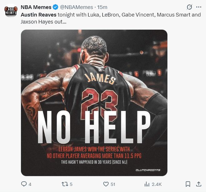 北京时间10月28日,湖人不敌开拓者。此役是湖人背靠背第二场,而且湖人多人伤停,奥斯汀-里夫斯又要独扛一队,三节他再度拿到30+,可末节明显感觉他陷入了疲劳期,连续不中后湖人败下阵来。美媒NBA Memes认为这场比赛的里夫斯就如同18詹皇。