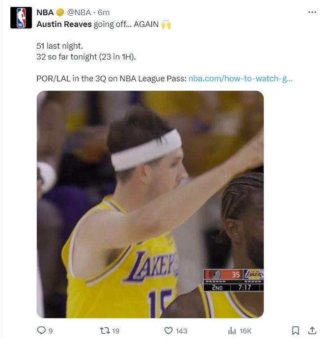 里夫斯前四场得到143分,追平湖人队史单赛季第三高纪录