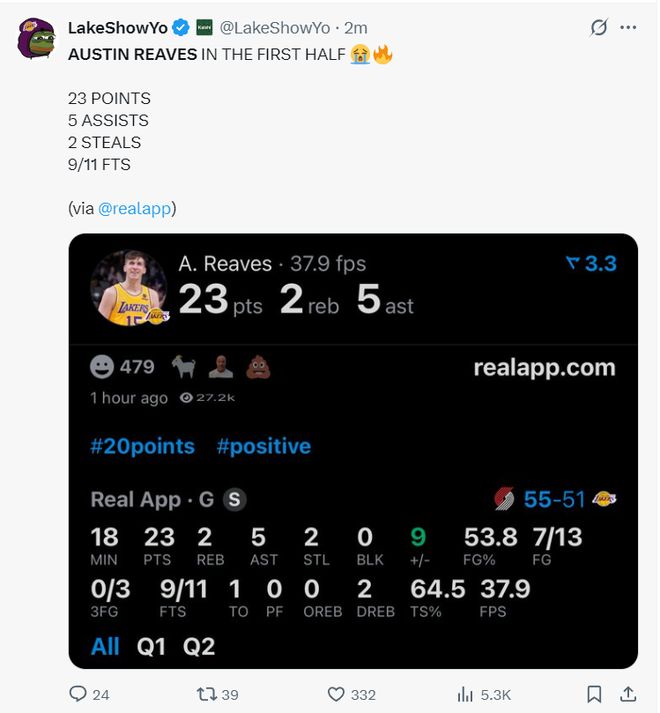 背靠背第二场VS开拓者,里皇依旧是湖人最无解的那个,19分钟,13中7,三分3中0,罚球11中9,拿到23分5助攻3篮板2抢断仅1失误,命中率53.8%,里夫斯半场又有11个罚球!他是两队上半场唯一拿20+的球员。(连续三场半场拿20+)