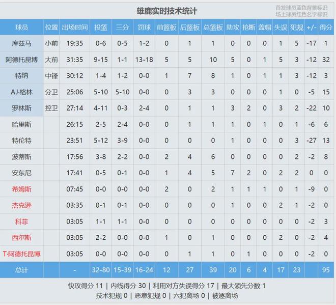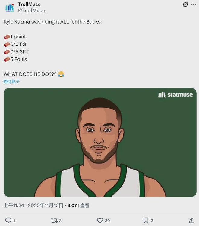 北京时间11月16日,NBA常规赛:雄鹿95-119惨败给湖人。雄鹿前锋库兹马首发出战19分35秒,6投0中,三分5中0,罚球2中1,仅得1分1篮板1失误5犯规,正负值-17。连媒体都无奈了,赛后写道:师傅,你是做什么工作的?